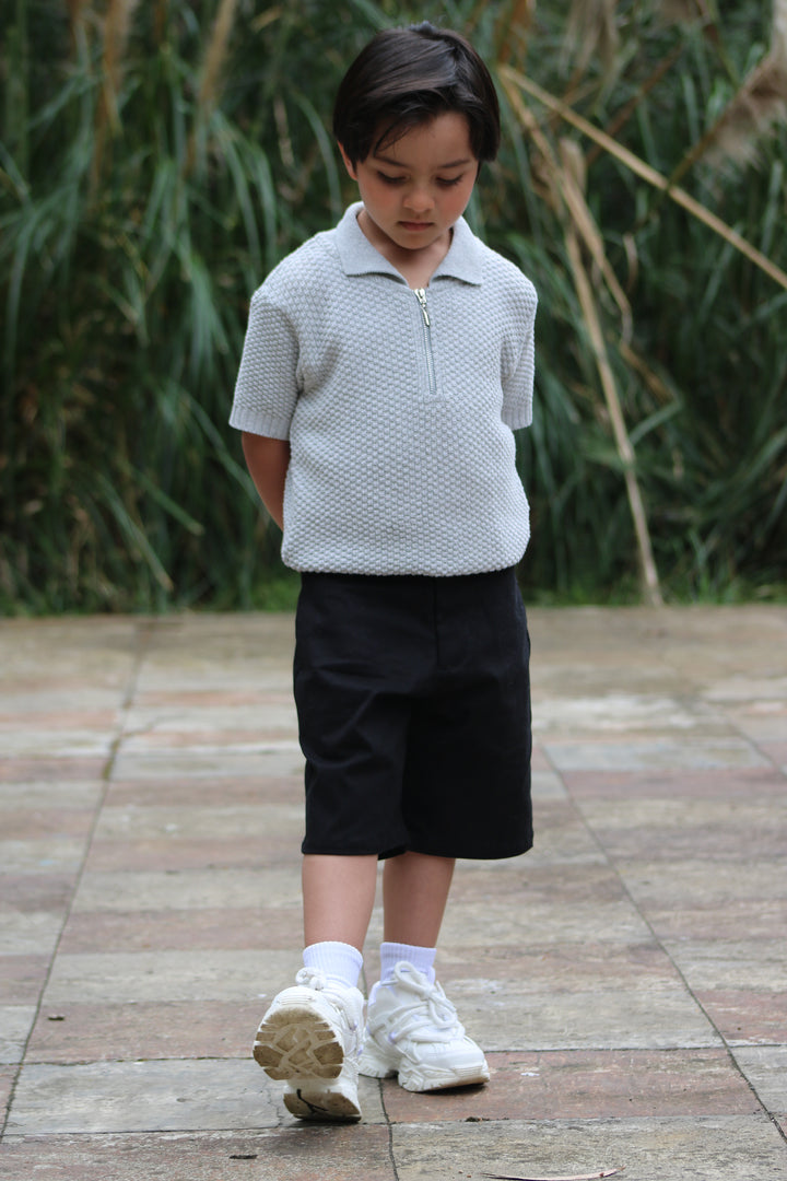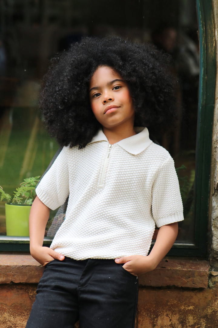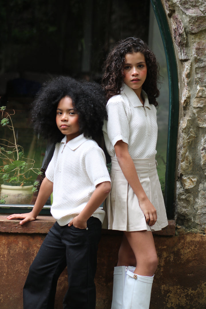 Su cuello tipo polo con cierre metálico corto añade un toque moderno, mientras que las mangas cortas y el ajuste relajado brindan libertad de movimiento y frescura. Una prenda versátil, perfecta para combinar con jeans, pantalones de lino o faldas, creando looks casuales con un aire refinado.