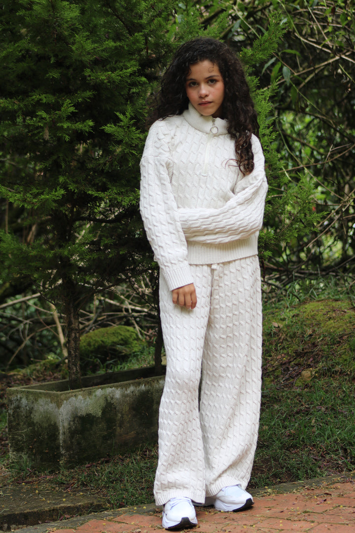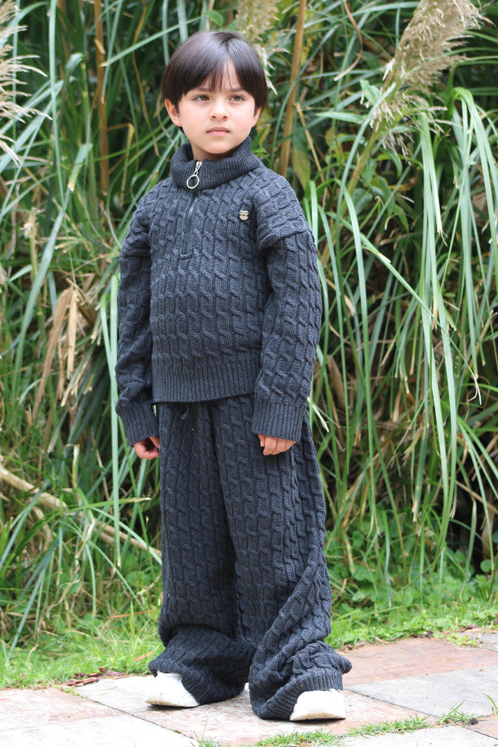 Este conjunto de dos piezas, elaborado en suave tejido de punto trenzado, combina comodidad y estilo para los más pequeños. Su diseño unisex y moderno lo convierte en una prenda versátil ideal para cualquier ocasión.