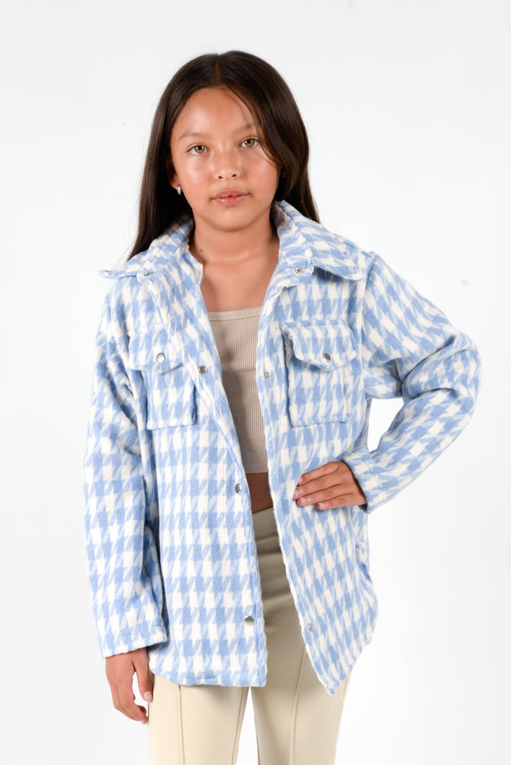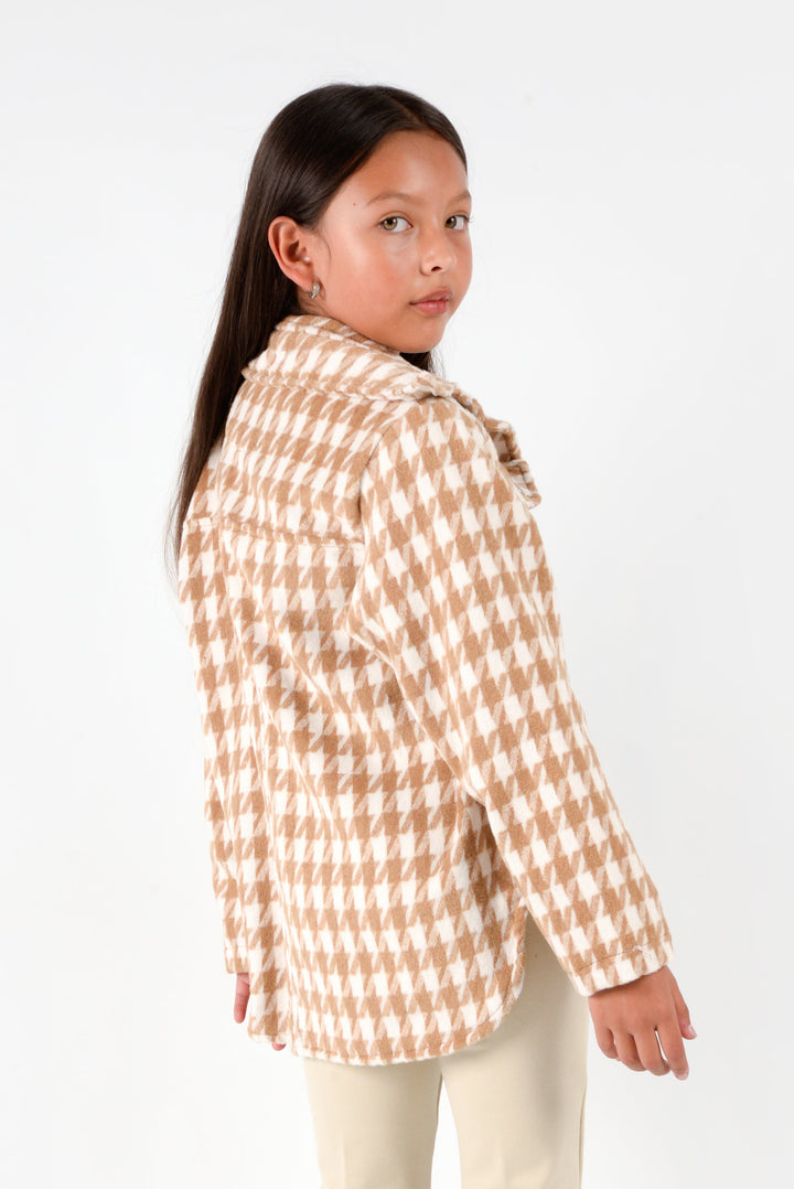 El Camisón Tiramisu es una prenda protagonista que combina un diseño clásico con un toque moderno y dulce. Su estampado houndstooth (pata de gallo) en tonos lila y blanco aporta un aire sofisticado y femenino, mientras que su silueta tipo sobrecamisa ofrece comodidad y versatilidad durante toda la temporada.